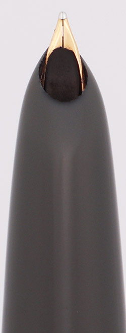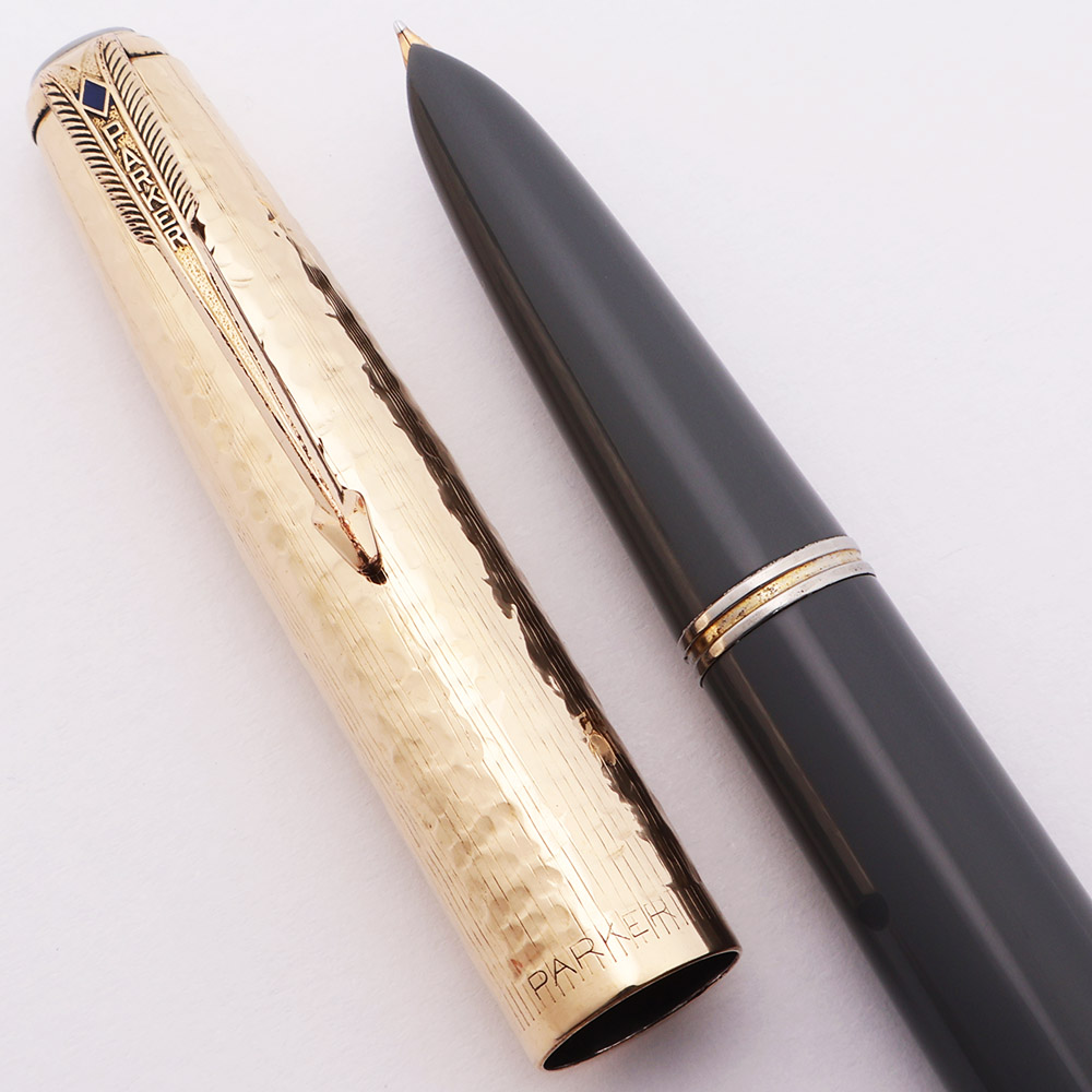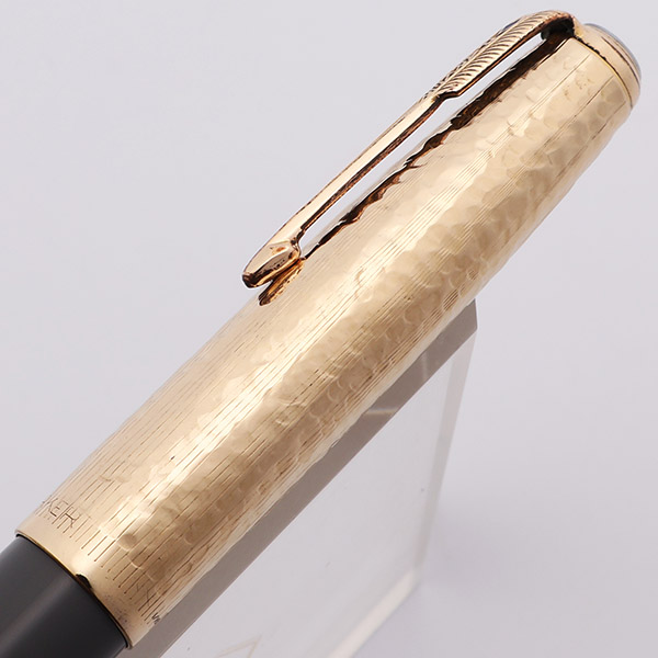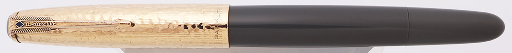 Manufacturer and Year Parker and Ariel Kullock, Argentina. The pen was assembled by the Kullock team using a combination of Parker parts. The cap started as a gold filled converging lines cap, which received a hammered "martele" treatment. The nib and filling system are Parker-made, but we're not sure about the barrel, blind cap and hood. Normally we'd expect to see an imprint on the barrel, but since this lacks one, it may indicate that Kullock made the plastic parts as well.