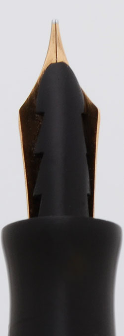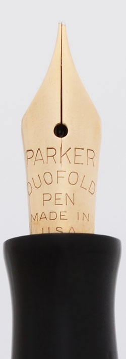 Nib FINE gold Parker Duofold Pen nib. There is a hairline crack running from the breather hole and stops short of the "F" in Duofold. This is a stable crack and will only be made worse by writing with too much pressure. Since this is not a flexible nib, there would be no reason to put stress on the crack.