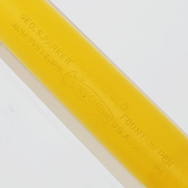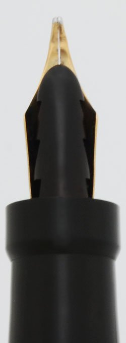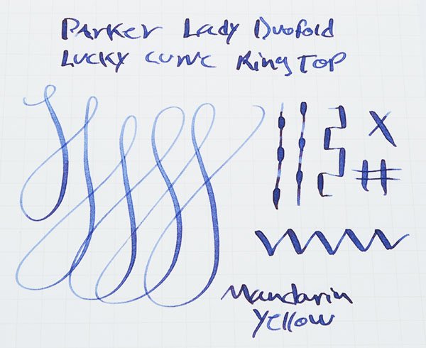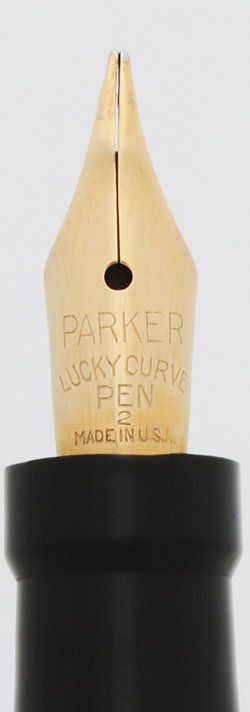 Nib Medium 14k flexible nib. It is labeled Parker Luckycurve 2. (See writing sample)