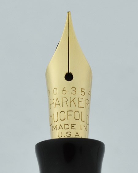 Nib EXTRA FINE Parker Duofold nib marked with a serial number. It has a christmas tree feed, it's smooth with nice tipping material, but no real flex.