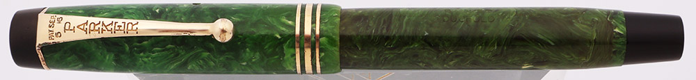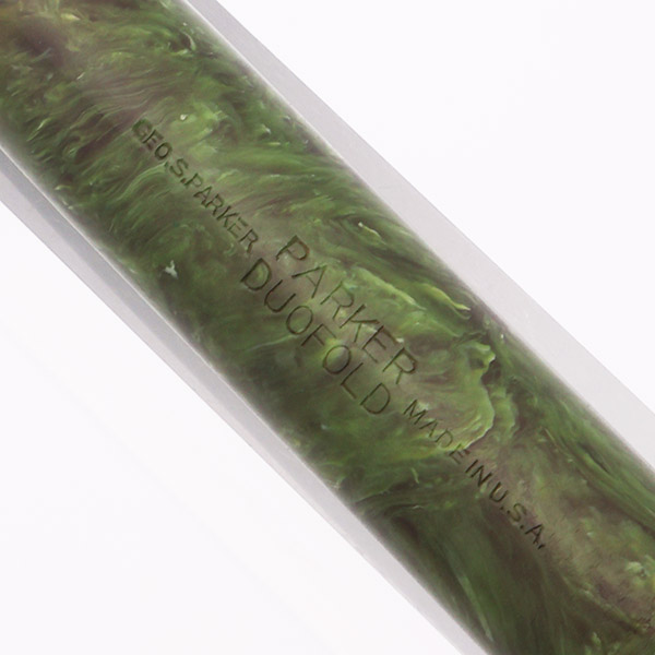 Condition Excellent condition with no cracks, chips, dents, or dings. This is a small, shiny pen in a lovely color pattern and in a classic design. The coloration on the barrel has darkened to a deep olive green color. The cap is closer to the original brighter "jade" green. The cap finial has faded from black to a chocolate brown. The section and blind cap are still a nice dark black. The cap and barrel have light to moderate scratching. The barrel has marks caused by the cap lip. The three cap bands have tiny dots of pitting. The ball of the clip and the edges have plating wear. The imprints are clear.