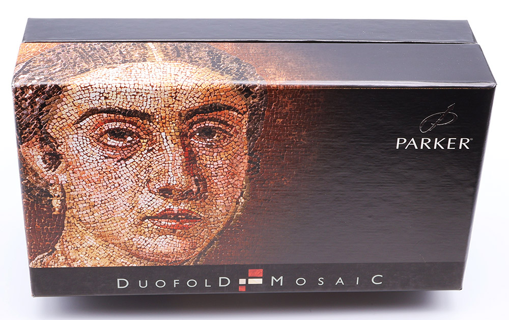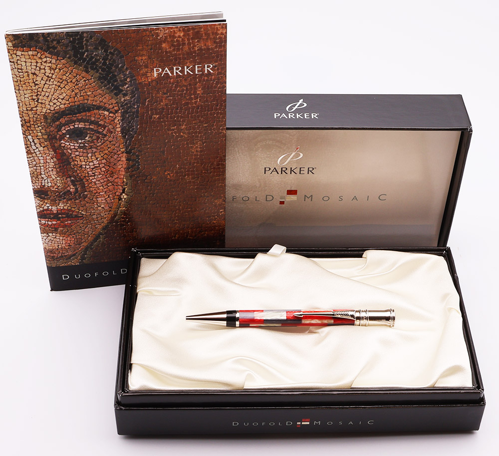 Condition Excellent + condition, in box, with paperwork. This is a beautifully colored, shiny pen with exceptional patterning in the mosaic. The pen has light signs of usage on the body, trim and clip. The imprints are clear.