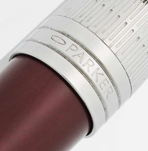 Color "Crimson Red", which looks more like burgundy to us. Ruthenium (dark gray-silver) cap, barrel finial, and section.