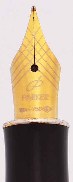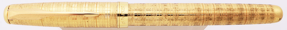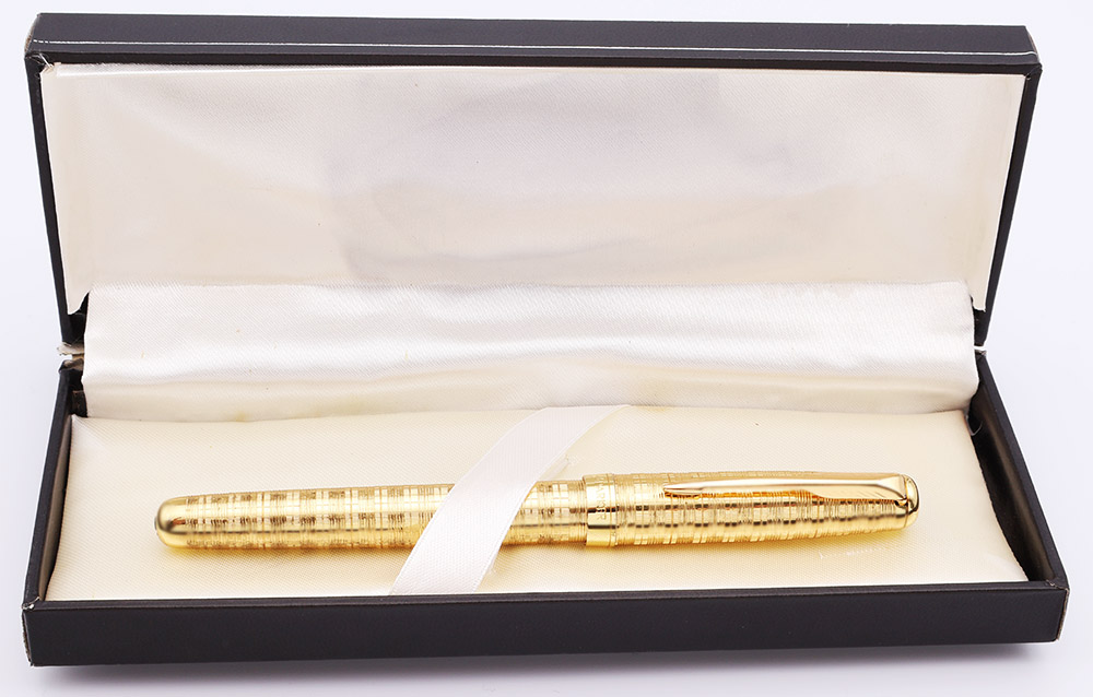 Condition Excellent condition, in box. This is a beautifully patterned pen that is shiny and golden. The cap and barrel have microscratching with no major or deep scratches. Some dots of tarnish but no brassing. The nib collar has a crack that looks like a gap (see photos), but the cap snaps on without a problem. The black section is excellent. The imprints are clear. In Parker box, but the upper interior of the box has come loose.