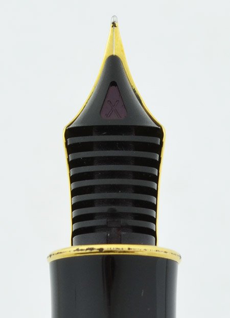 Nib EXTRA FINE 18k nib is smooth with nice tipping material with a feed marked X. It's smooth and has just a little flex to it so that it can produce a medium line with a little pressure.