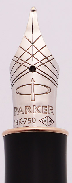 Nib FINE 18k nib. There is an "F" on the back of the feed. (This nib was damaged and has been straightened out, but there's still some waviness.)
