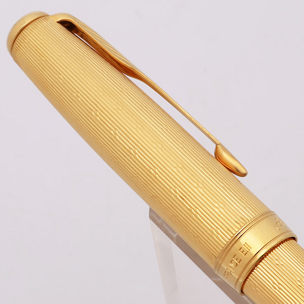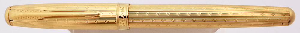 Condition. Excellent condition with no cracks, chips, dents, dings, or plating wear. This is a lovely, elegant pen that is shiny and that sparkles. The cap and barrel are in gorgeous condition. The cap band has some light scratching. The clip has microscratching along the top and around the edge of the clip band. The section has handwear and scratching; the trim ring just behind the nib looks great, with no brassing or plating wear. The black jewels have some scuffs. The imprints are clear.