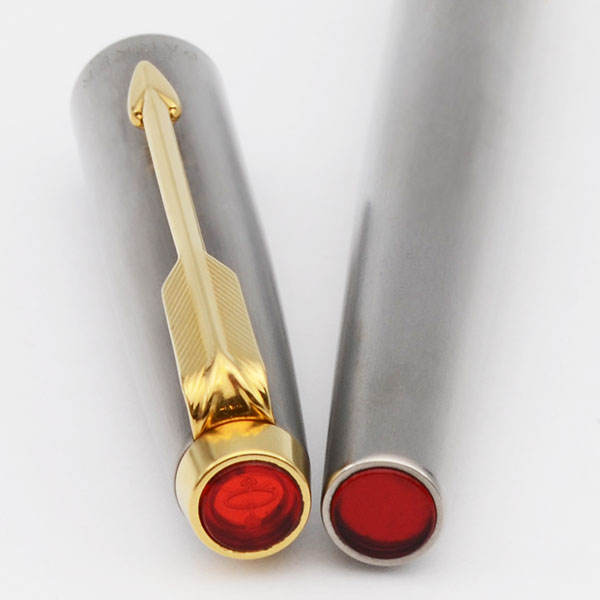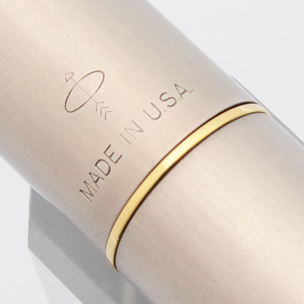Color Brushed titanium pen with gold plated trim. The section and nib are a single unit. There are semi-transparent red "jewels" inset at both ends of the pen. This is the darker in color of the two brushed finishes.