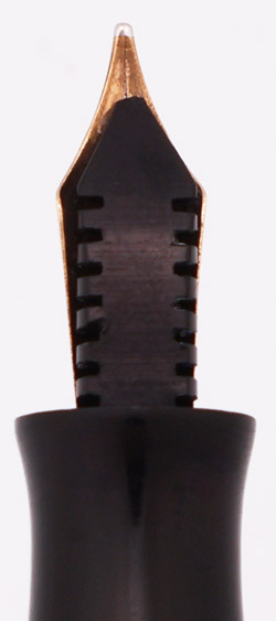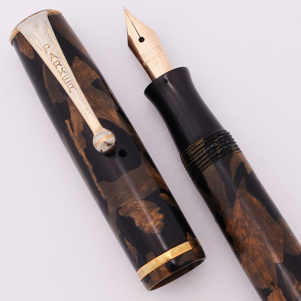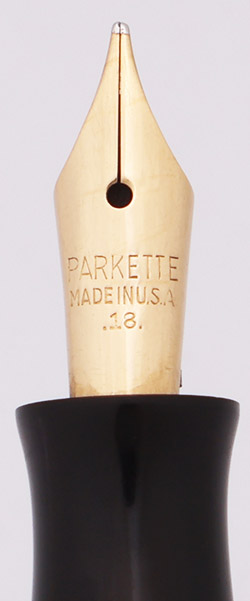 Nib MEDIUM gold nib is marked "Parkette Made In USA .18.", indicating that it was made in 1938. It's smooth with great tipping material and has just a little give to it. This nib is a replacement from the original.