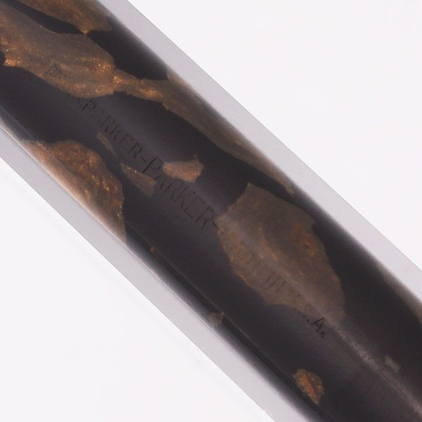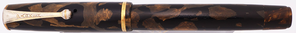 Color Black and bronze marbled celluloid with gold plated trim, a thin cap band, and a metal clip-screw.