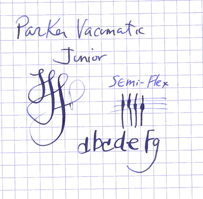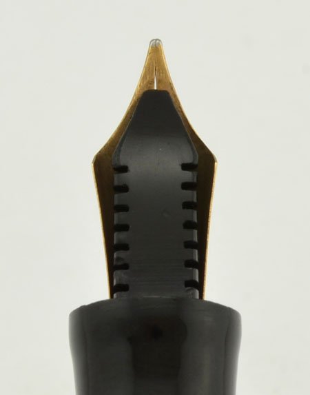 | Nib | 14k fine "Vacumatic" nib. Writes smoothly with a wet line. Lots of tipping material in evidence. It has some flex to it and you get some line variation, so we'll call it semi-flex. (We can't see the nib markings well enoguh to tell if it was also made in Canada.) See writing sample below. |