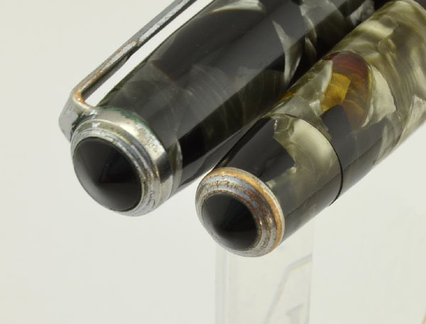 The pen's body is smooth and largely free from scratches. The imprint is very readable. The clip is good with light brassing, but the plating on the cap bands has mostly worn off. The black jewels are good. |