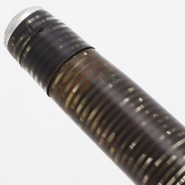 Condition Excellent condition. The cap has light scratching, with some more moderate scratching near the top. The clip has light scratching and some spots of plating wear, and there is plating wear on the clip ring and tassie. The cap jewel looks great. The cap bands have scratching and moderate plating wear and brassing. The barrel looks good (really excellent clarity!), with light to moderate scratching. The blind cap looks like it broke and was glued back together - there's a fairly clear seam around it and roughness that's probably glue residue. There are also heavy scratches. The imprint is clear and easily readable, though we don't see a date code. The trim ring on the blind cap has scratching and brassing. The blind cap jewel also has scratches and marks. .