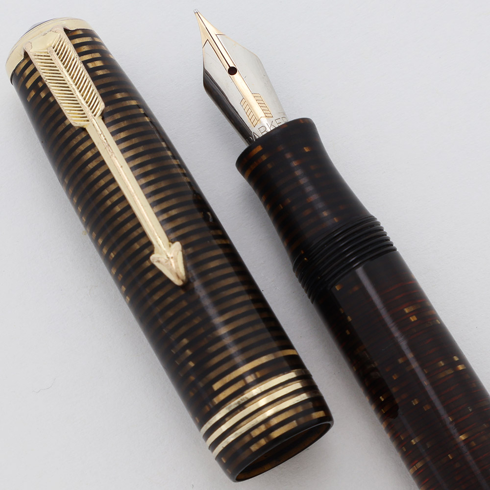 Condition Excellent + condition with no cracks, chips, dents, or dings. This is a beautifully colored, shiny pen in a classic Parker design. The barrel has marks caused by the cap lip and moderate scratching. The barrel has semi-transparency and nice clarity in that range. The cap has moderate to heavy scratching. The triple cap band has moderate microscratching and some plating wear along edges. The arrow clip has plating wear on the arrow end and light microscratching elsewhere. The clip band has plating wear along the edges but it is shiny and looks good. The top striped jewel has light microscratching. The striped jewel at the end of the barrel has light microscratching. The imprints are difficult to read but they are visible and can be deciphered especially with magnification.