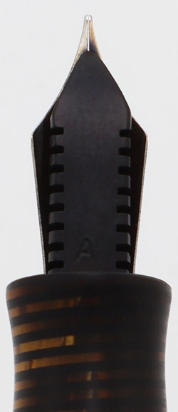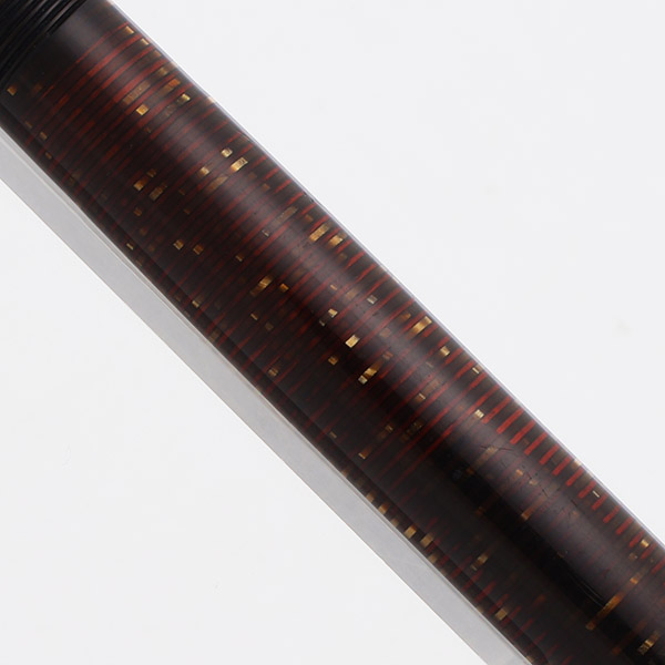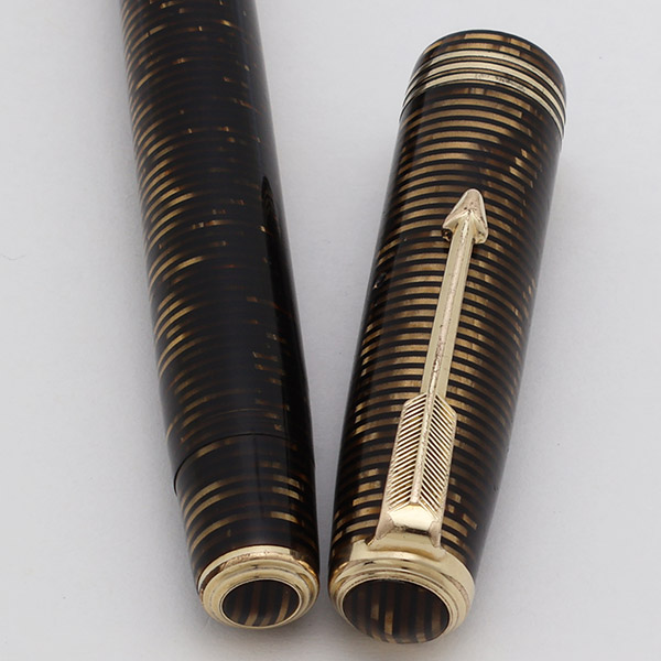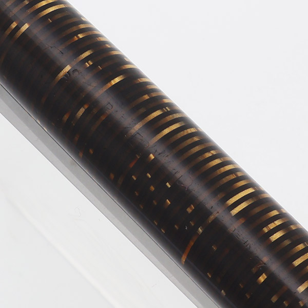 Color "Golden Pearl" with gold plated trim. Alternating amber pearl and black bands and, on the barrel, semi-transparent amber and black bands. The jewels are striped. The cap has a narrow trio of bands.