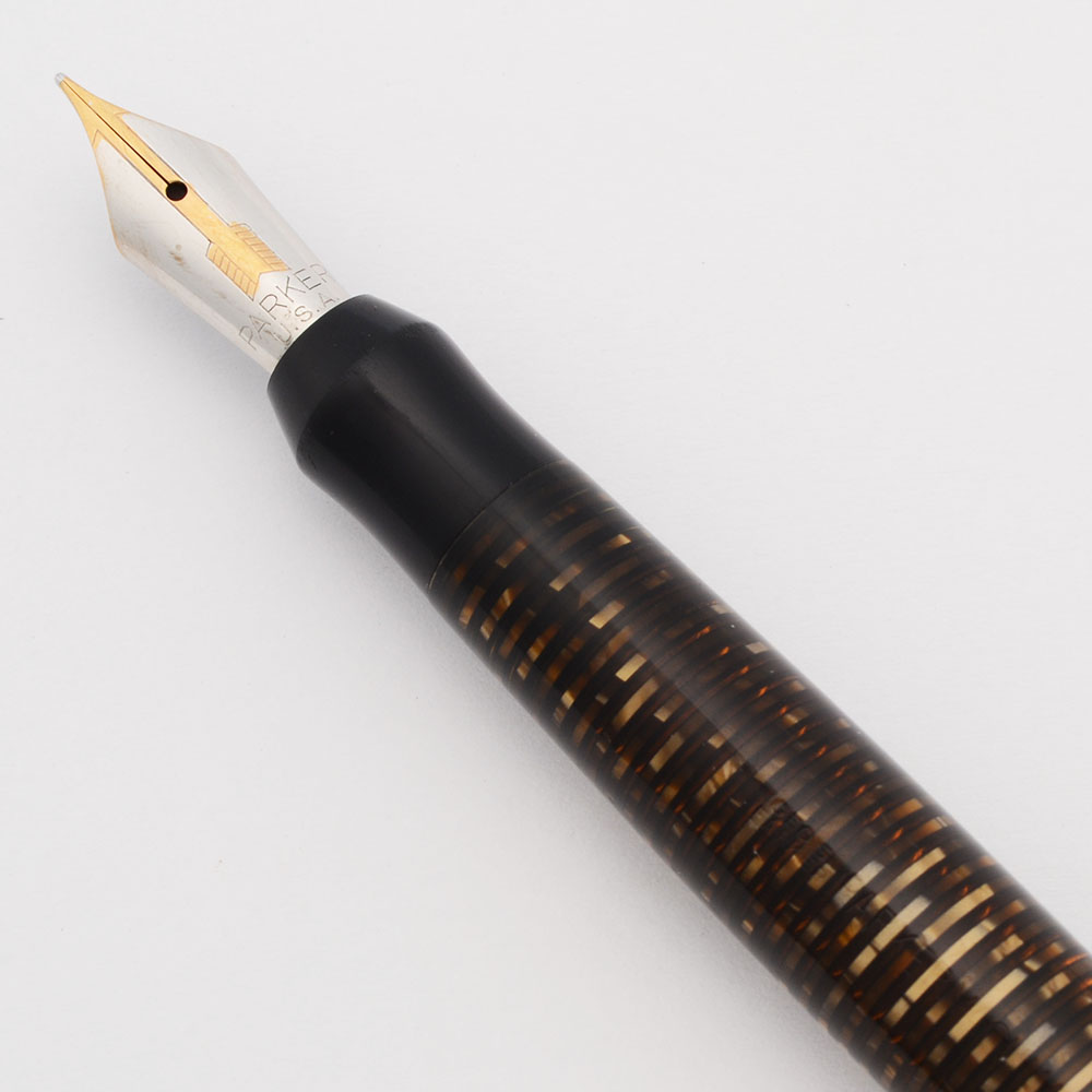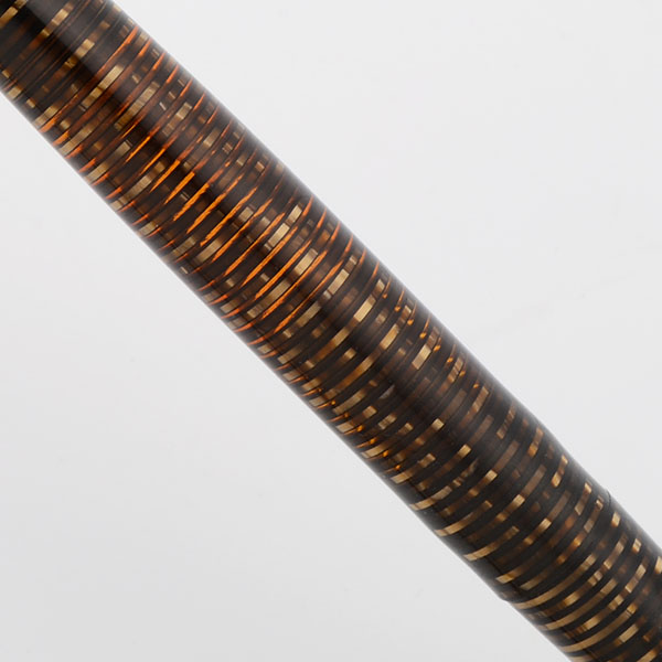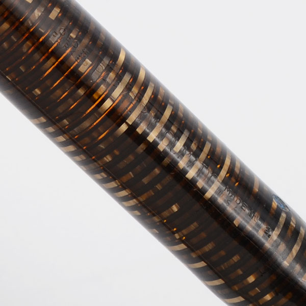 Color Golden Pearl w/black section. It has alternating brown pearl bands and semi-transparent amber bands. Blue diamond near the end of the top portion of the pen.