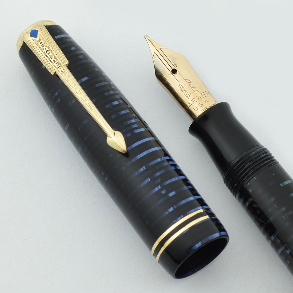 Color Azure blue pearl body and cap with gold plated trim and double jewels. Fairly good visibility through the body.