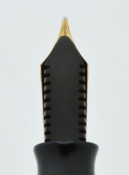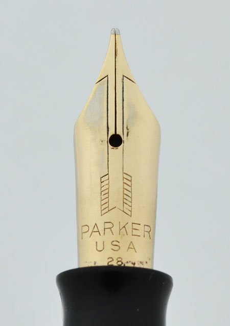 Nib MEDIUM 14k Parker #28 nib. Lots of tipping material in evidence. It's quite firm and smooth. It was probably two-tone to begin with, but most of the masking has worn off.
