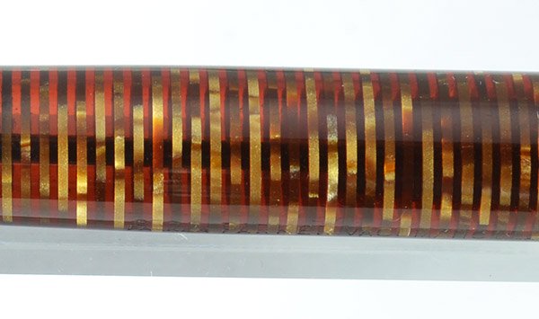 Color Golden pearl color with gold plated trim, three thin cap bands, a black barrel jewel and a striped cap jewel (we see the black barrel jewels fairly often). The barrel clarity is really fantastic.