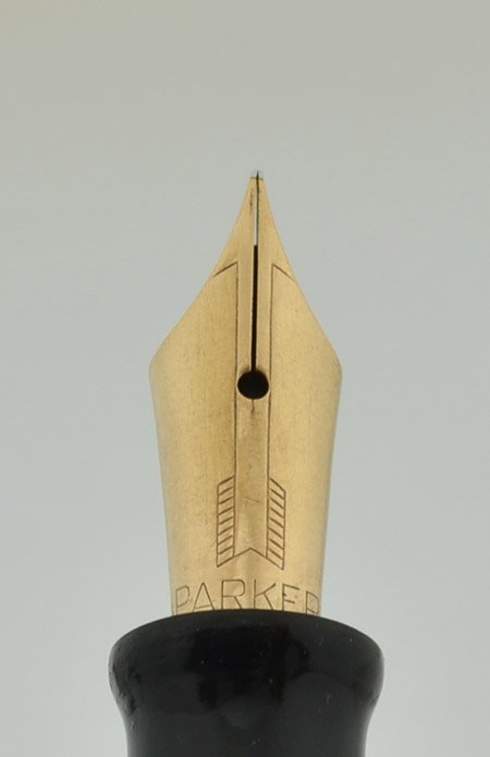 Nib EXTRA FINE gold arrow style Parker USA nib. It's smooth with nice tipping, and is fairly springy.