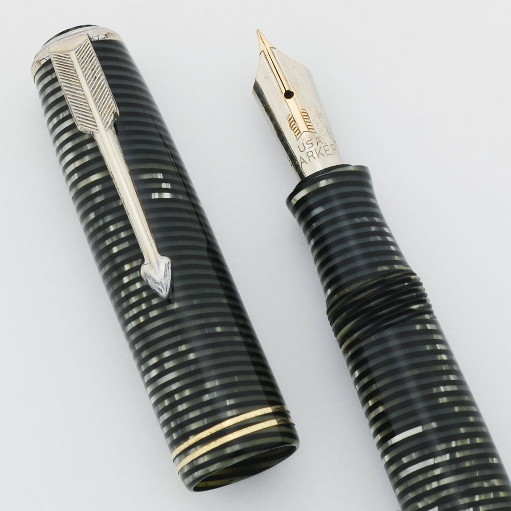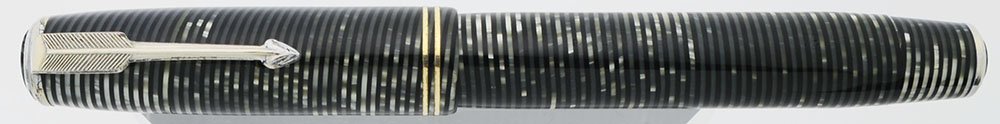 Color Silver Pearl laminate body and cap with nickel plated trim. The cap has an arrow clip and two narrow cap bands. The trim was originally nickel plated, but the cap bands look gold so they were probably originally nickel plated as the rest of the trim does not look like it was originally gold plated. Two striped jewels.