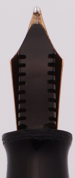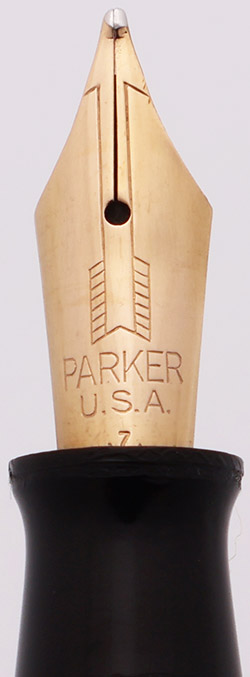 Nib BROAD 14k nib. It is smooth and springy with nice tipping material. The date code on it is a .7., which doesn't match the date on the barrel, but we know it was fairly common to swap out these nibs.