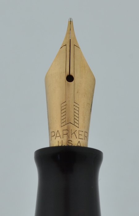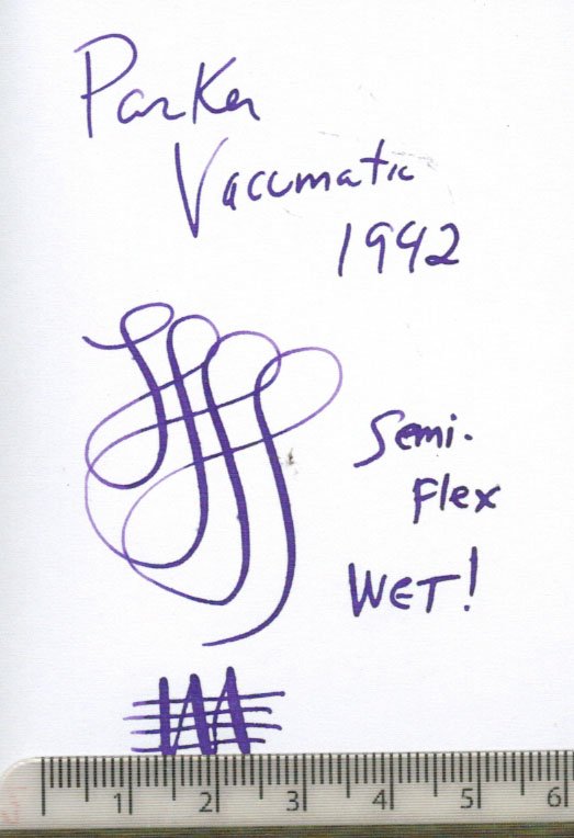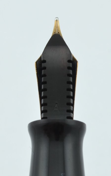 Nib SEMI-FLEXIBLE FINE 14k nib. Smooth with nice tipping material. It flexes easily from fine to a broad line, and with almost no pressure writes with a medium width on the downstrokes. See writing sample.