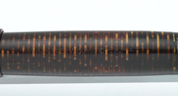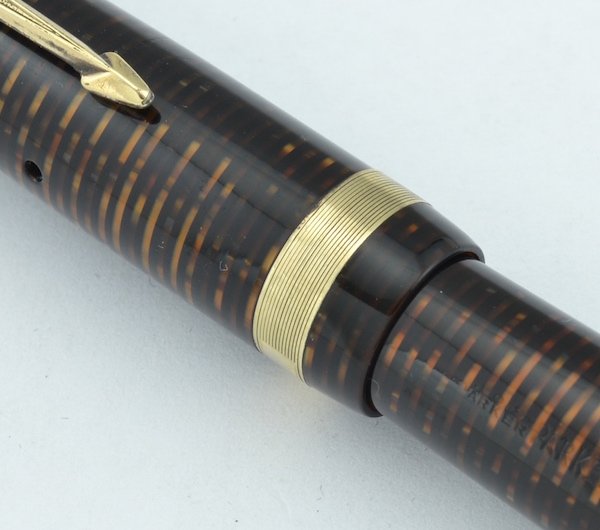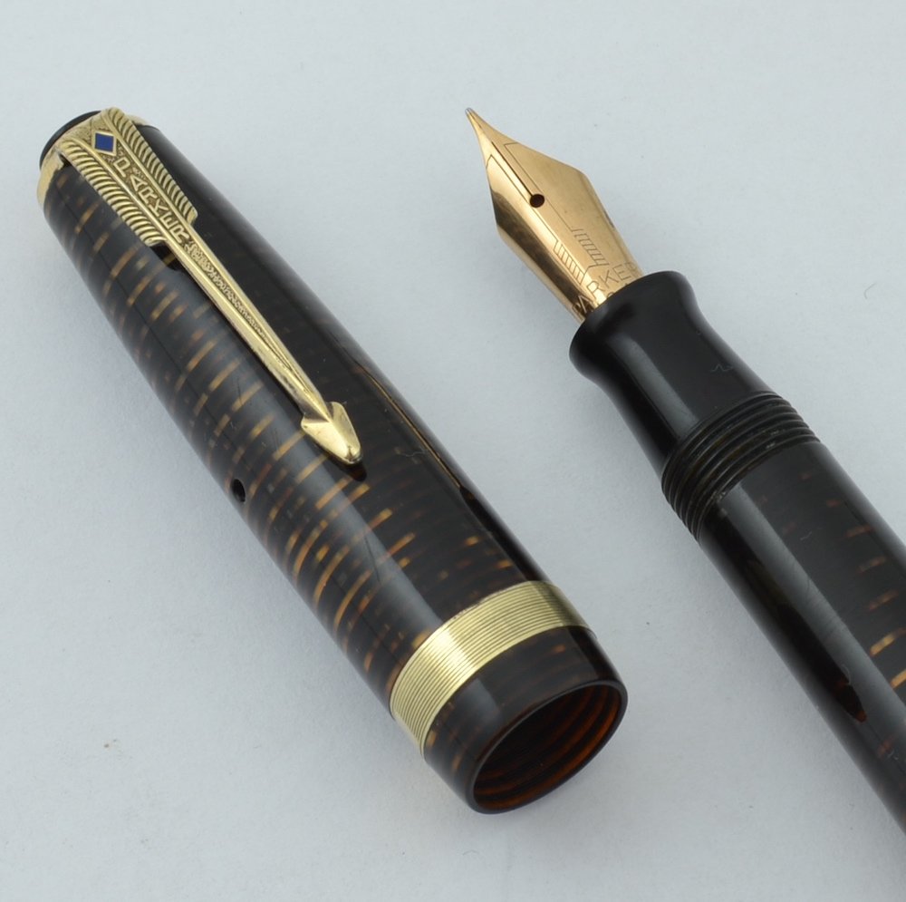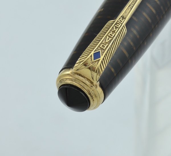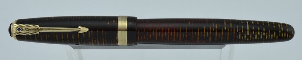 Color Golden pearl color with gold plated trim, black jewel, a blue diamond clip, and the uncommon "stacked-coins" cap band also known as Jewelers band because they were only sold in jewelry stores.