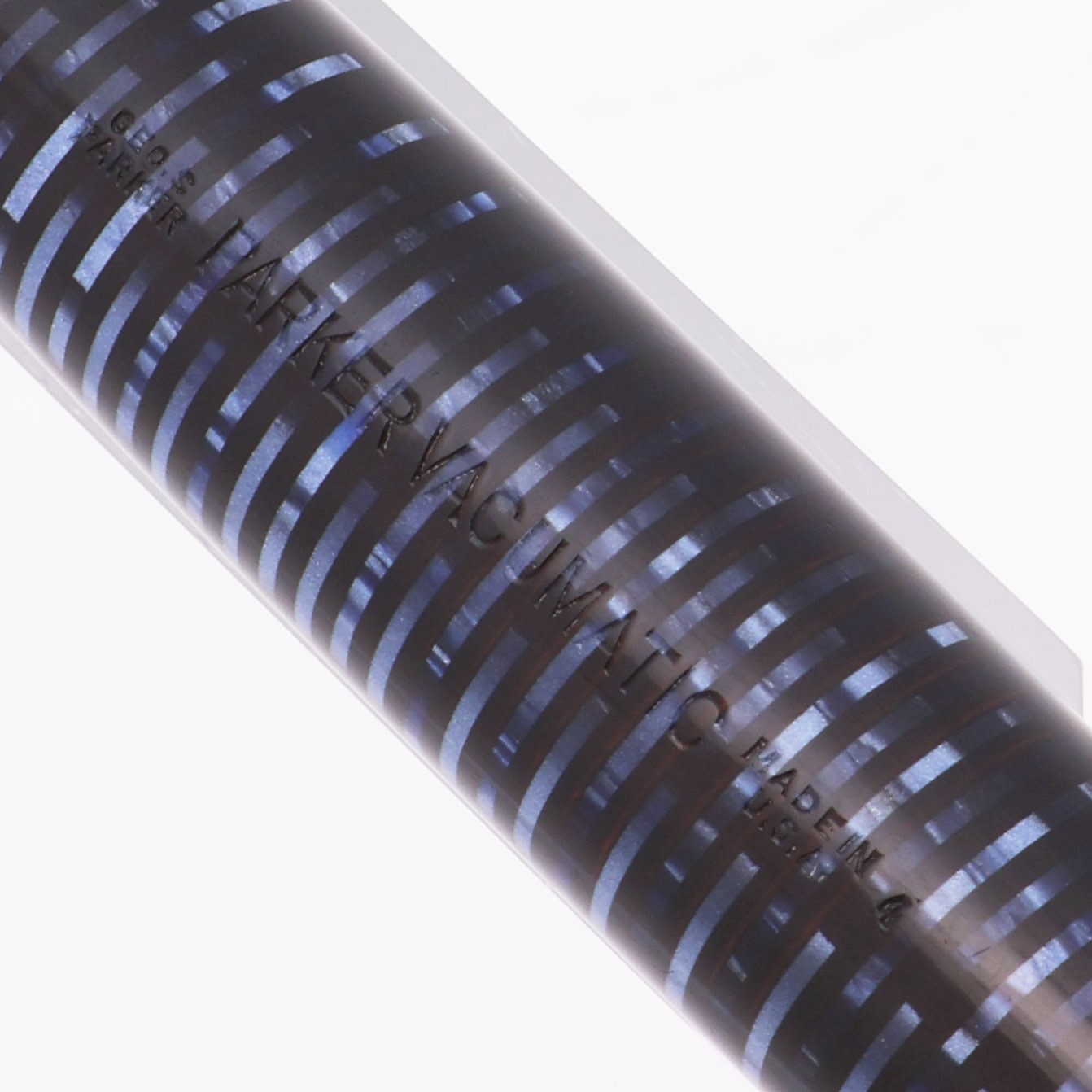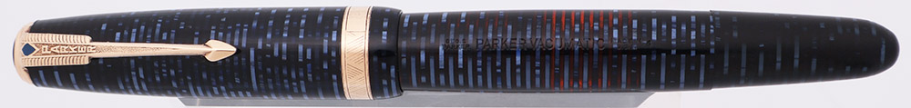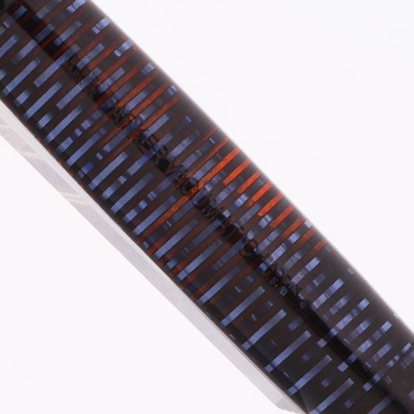 Color Azure Blue Pearl, a blue striped pattern that you can see through in sunlight. Black jewel and Blue Diamond clip. The cap band is about 1/8" wide, with a chevron design.
