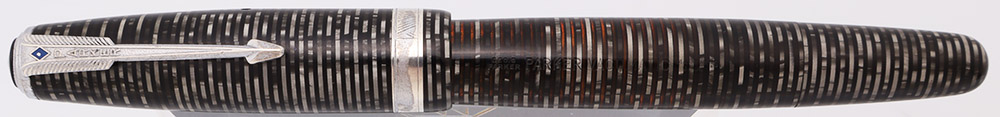 Condition Excellent condition with no cracks, chips, dents, or dings. This is a dark, shiny fountain pen with a nice pattern, and in a classic design. The transparent barrel has ambered quite a bit, but the transparency remains quite good. The cap and barrel have moderate scratching with areas of heavier scratching on the barrel. The cap band has plating wear and microscratching. The clip and clip ring have plating wear and brassing all over. The blue diamond is missing some paint. The black top jewel is excellent. The imprints are clear.