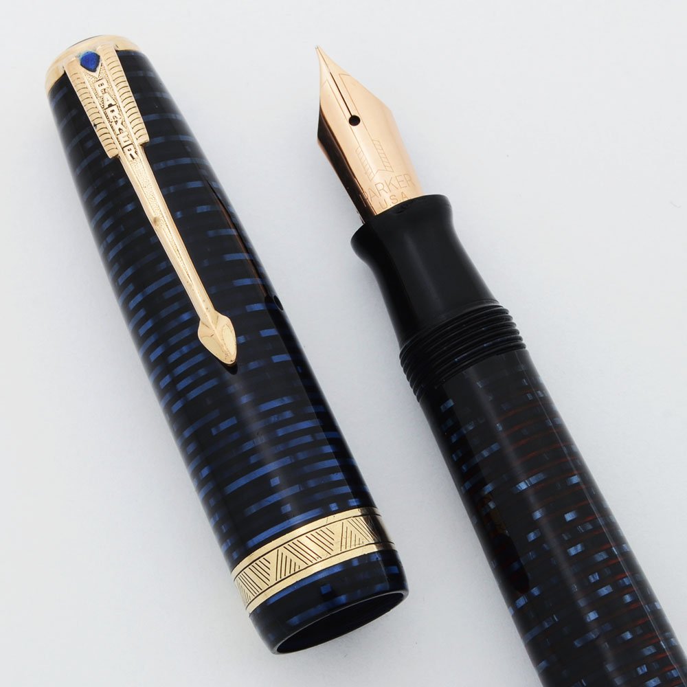 Color Azure Pearl body and cap with gold plated trim. It has alternating blue-gray pearl bands and semi-transparent amber bands. The cap has a black cap jewel and a chevron patterned cap band just over 1/8". It has a blue diamond clip.