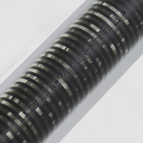 Color Grey Pearl body and cap, matching striped cap jewel with nickel trim, an art deco arrow clip, and a three ring cap band.