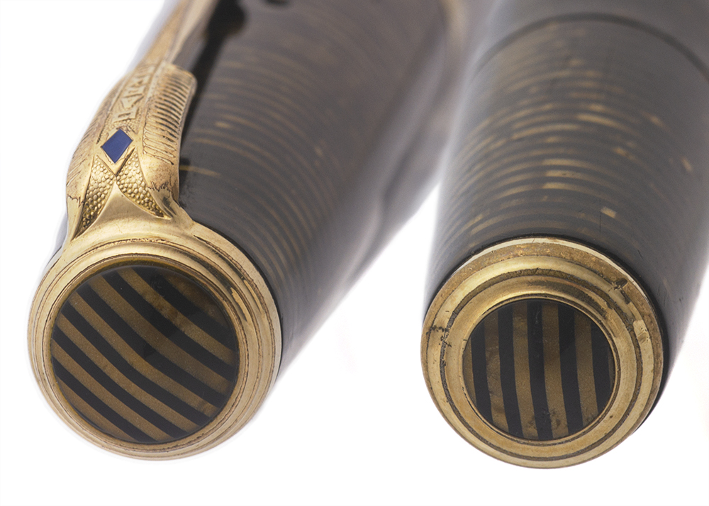 Color Golden brown barrel and cap with ambered transparent horizontal lines. 1/4" gold Chevron style cap band, striped jewels matching the pen's coloration on top of the cap, and at the end of the barrel. Blue diamond clip.
