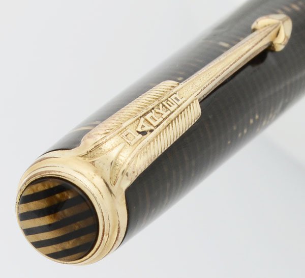 Color Brown Pearl body, cap, and cap jewel with gold plated trim and a wide 1/4" cap band with interlocking V pattern.