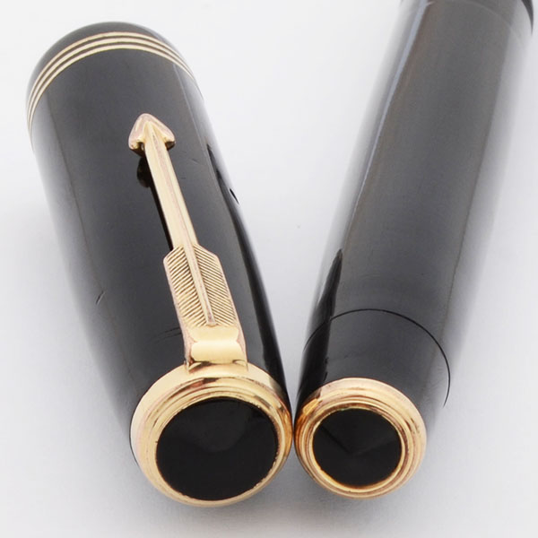 Condition Excellent + condition with no cracks, chips, dents, or dings. This is a large-sized, shiny pen, with great barrel transparency through the black and amber circumference rings on the barrel, and the rich, velvety black cap. The barrel looks excellent with some moderate scratching on the end piece. The cap has some moderate scratching near the top and on either side of the top of the clip. The three thin cap bands have some plating wear on the edges. The clip has a bit of plating wear along the edges of the arrow end. The clip ring has plating wear along the edges. The cap jewels are excellent. The imprint is somewhat faded, but readable.