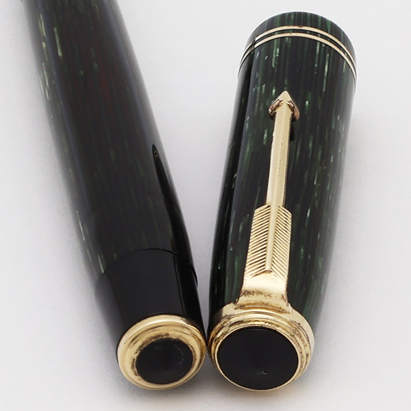 Color The pattern is called "Shadow Wave". Green striped body and cap with gold plated trim. Good visibility thru the body. Both jewels are black.
