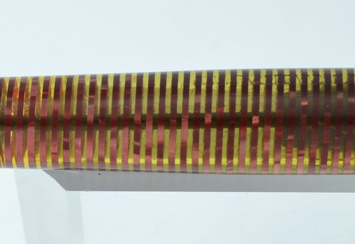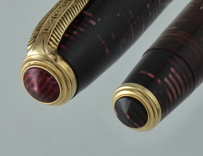 Color Burgundy pearl color with gold filled trim, three thin cap bands, and a striped jewel on the top and bottom of the pen.