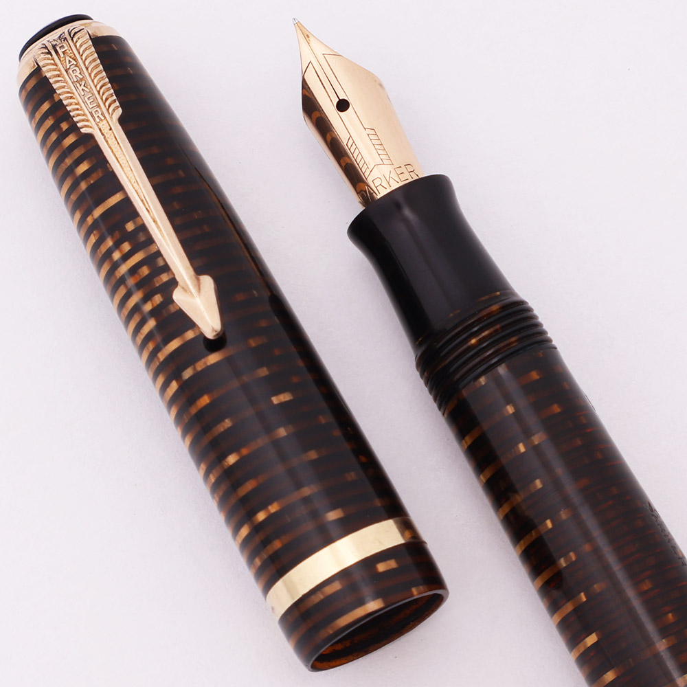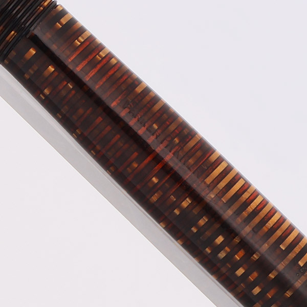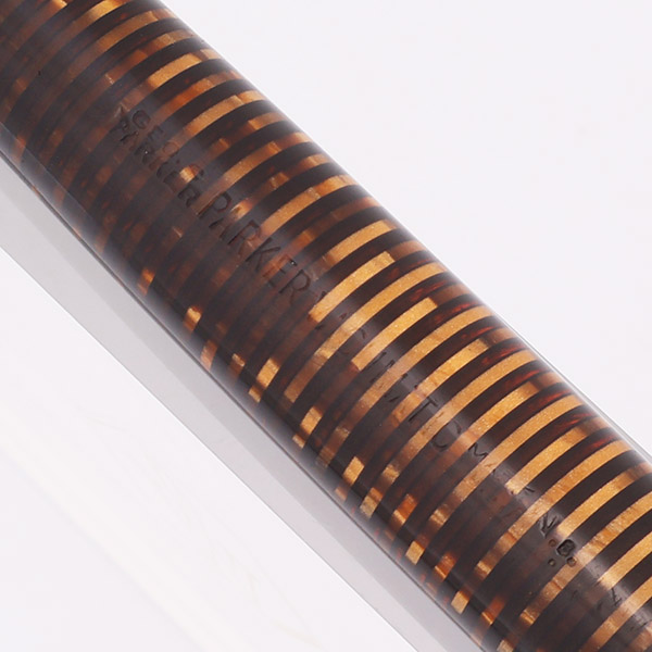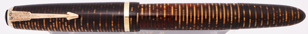 Color Golden (brown) Pearl bands alternating with semi-transparent amber bands. It has gold filled trim and a short clip. Cap band is plain. The pen has a black cap jewel.