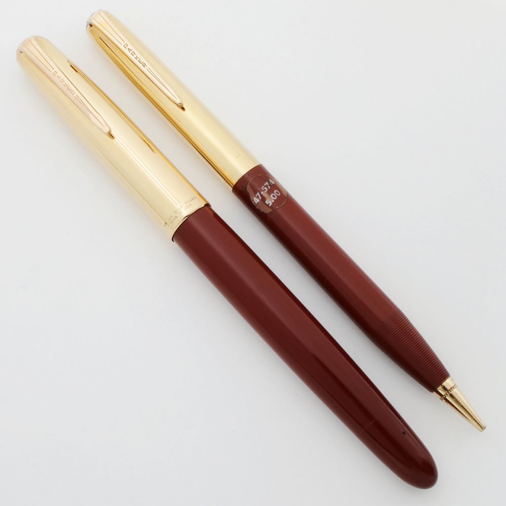 Condition Excellent + condition. Fountain pen: Microscratching all over, but still appears very shiny in the hand. No cracks, chips, dents, dings, or personalization. Pencil: Aside from a small dent on the cap to the left of the clip, it is in similar condition to the pen. No eyecatching brassing or plating wear on either piece. The imprints are still quite clean and readable. Both jewels are perfect. Pencil still has original price sticker affixed to barrel.