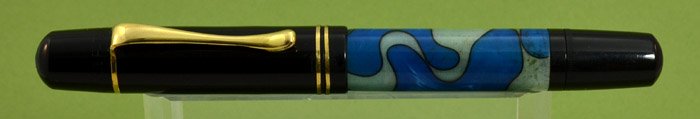 | Color | Black cap and barrel end. Green window in the barrel, and a custom semi-transparent sleeve that is a blue and white marble design. (The barrel is constructed of clear green material, and on the normal pens you'll see the thin marbled sleeve or "bind" that Pelikan installed .... on this pen it has been replaced with a custom sleeve, not by Pelikan.) |