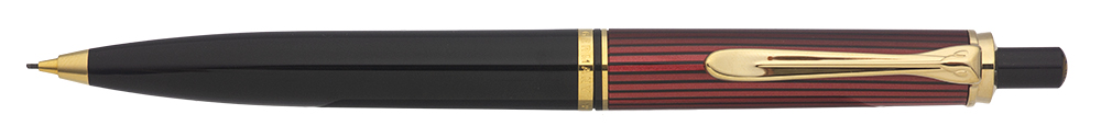 Color Black resin barrel with red and black striped upper half. It has gold plated trim.