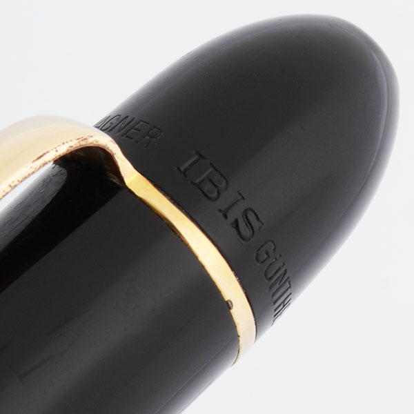 Condition Excellent condition with no cracks, chips, dents, or dings. This is a velvety black, shiny pen that is small and rounded. The barrel has light to moderate microscratching. There is an "F" engraved above the blind cap. The green viewing window is mirky with scratches and ink stains. The cap has light to moderate scratching with most of the marks to the left of the clip and along the cap lip. The clip is excellent, with good plating. The cap band has microscratching and a bit of pitting and plating wear along some of the edges. The imprint at the top of the cap, "Ibis Gunther Wagner Germany" is clear.