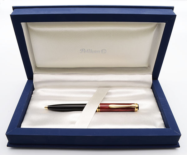 Condition Excellent + condition, in box, with paperwork. This is a beautiful, classically designed ballpoint that is eye-catching. The barrel has some light wear. The cap is perfect. The cap band has microscratching, primary over the GERMANY imprint. The clip has a tad of microscratching on the end. The clip band and gold tassie has some light plating wear along the edges. The imprints are clear.