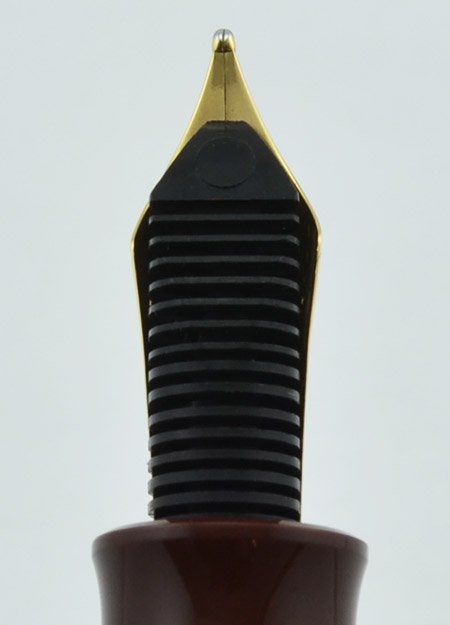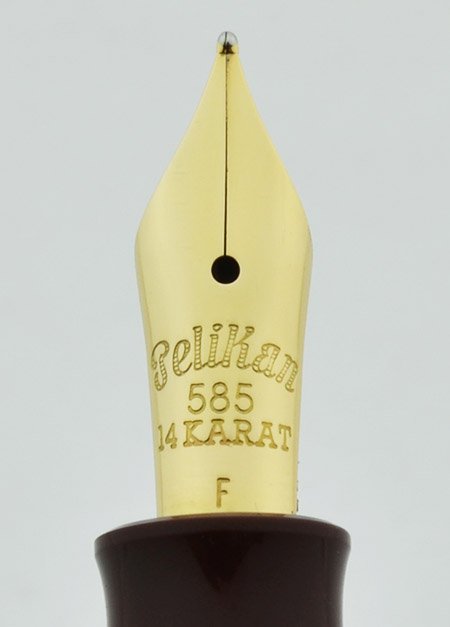 Nib 14k fine nib. It has a simple, vintage style Pelikan imprint. Like the rest of the pen, the nib shows hardly any evidence of usage. Excellent, rounded tipping material for smooth writing and decent give.