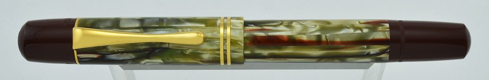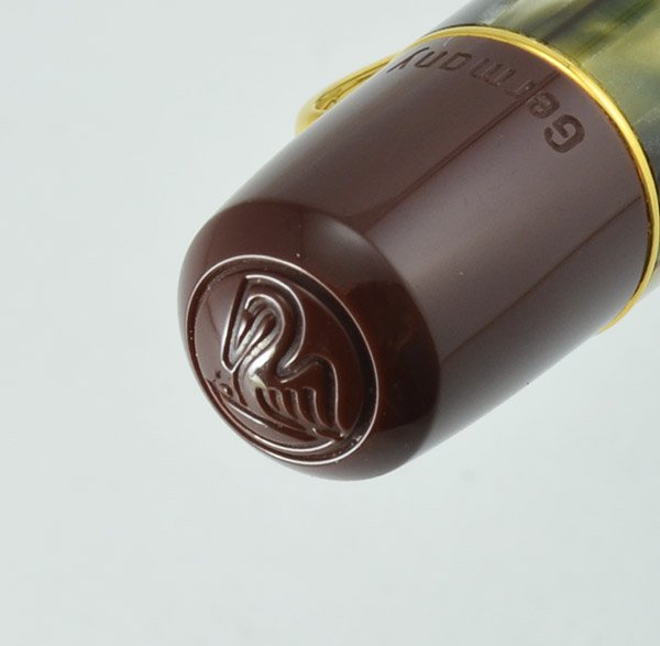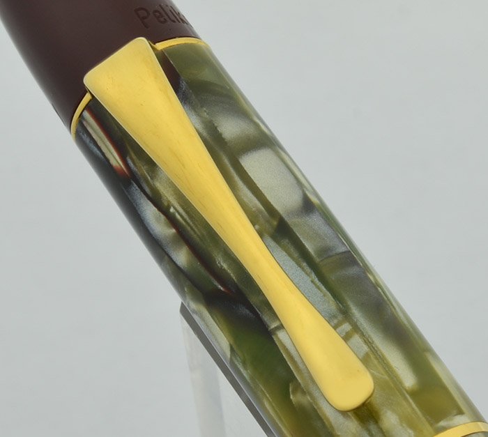 Color Tortoise shell green barrel and cap with brown end pieces and section. There is a green tinted viewing window common to many Pelikan piston fillers. The tortoise material is semitransparent. Gold plated trim. A reimagining of a classic.