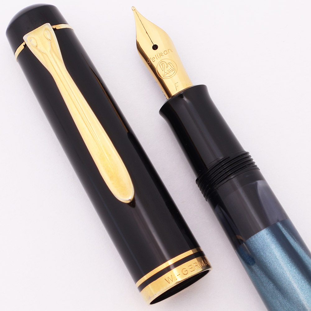 Condition Excellent condition with no cracks, chips, dents, or dings. This is a beautifully colored, shiny pen with some pearlescence in the barrel material. The barrel has light to some moderate scratching that is difficult to see due to the color pattern. The piston knob has moderate scratching. The cap has moderate to heavy scratching. The cap band and clip have scratching and some brassing. The clip band has scratching and some dots of pitting. The top Pelikan logo looks good. The imprints are clear.