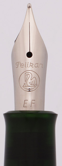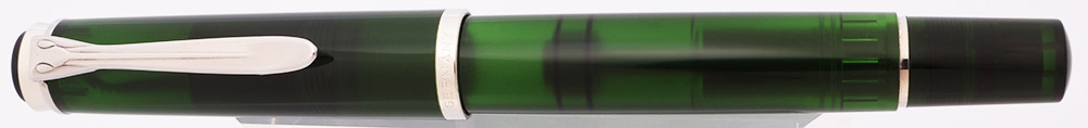 Condition Excellent + condition with no cracks, chips, dents, or dings. This is a gorgeous demonstrator in a unique color. The barrel has a filtered transparency. The barrel has marks caused by the cap lip and some light scratches mid-barrel. The cap has some microdot marks here and there but it looks great overall. The trim shows light signs of usage. The pelican logo at the top of the cap is perfect. The imprints are clear.