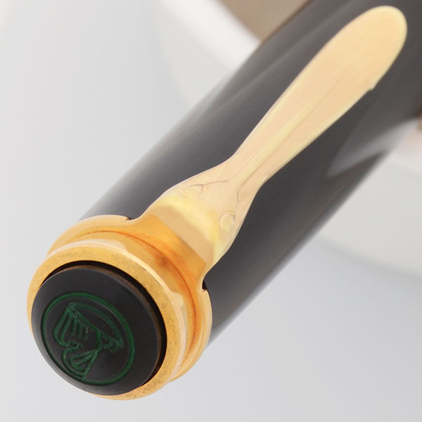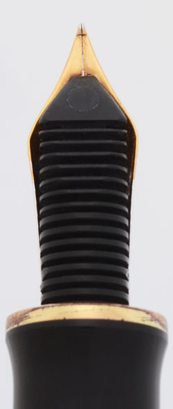 Condition Excellent + condition. Slight staining in the ink viewing window. Plating corrosion on the trim ring at the front of the section; the rest of the trim looks fantastic. Microscratching on the barrel and cap, but no significant individual scratches. No cracks or chips. Etched logo at the top of the crown cap looks great. Imprints are clear.