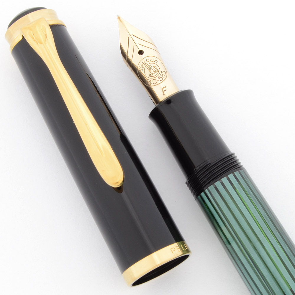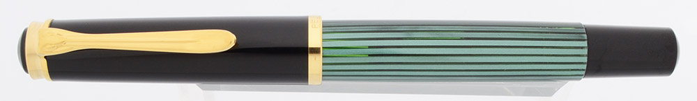 Color Green and black stripes on the barrel with black cap and piston knob. Gold plated trim. The derby cap is black with the Pelikan logo engraved and filled in green.