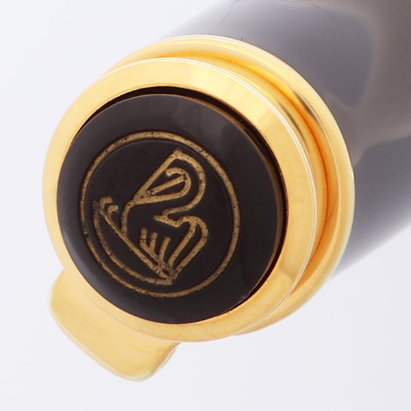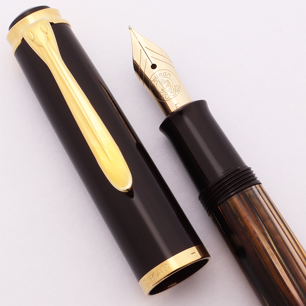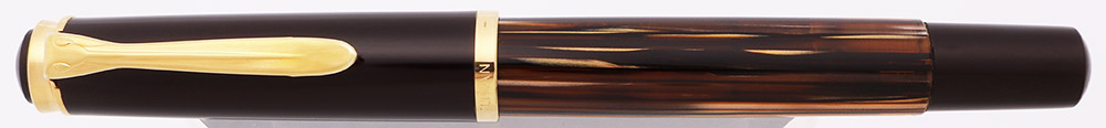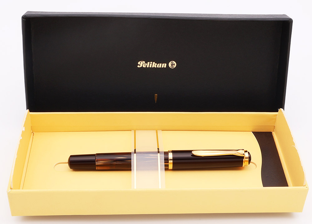 Condition Excellent + condition, in box. The trim looks great, with no brassing or plating wear. The etched bird logo on top of the cap looks quite nice, and has most of the paint in its grooves. There is light scratching and handwear all over. The end of the barrel has some scratches from posting the cap. The barrel translucency is excellent. Ships in Pelikan box, with paperwork. We guarantee the filling system for a year.